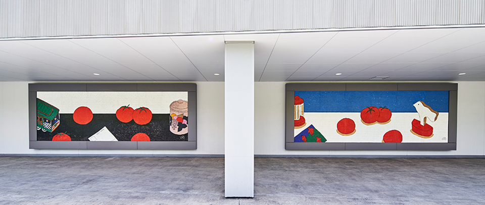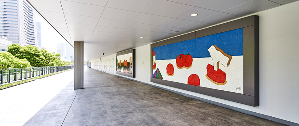 日本を代表するイラストレーター。村上春樹との共著をはじめ、絵本、漫画、エッセイ、小説、俳句など、多岐にわたって活躍。本作は1996年、帝国ホテル大阪内「フライングトマトカフェ」の壁画として描かれたタイル画。2018年の店舗改装を機に完全修復を施し、ここ「ぴあアリーナMM」に移設。