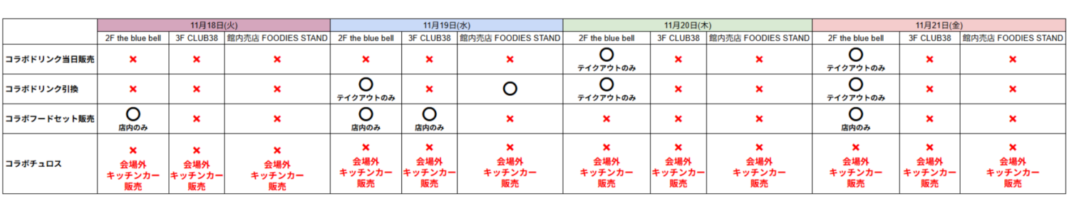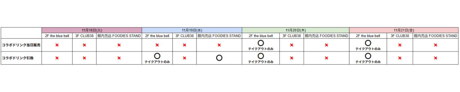※20日(木)、21日(金)に関しては館外2F The Blue Bellの店舗においてドリンク引換チケットの引換、およびコラボドリンクの当日販売を行います。