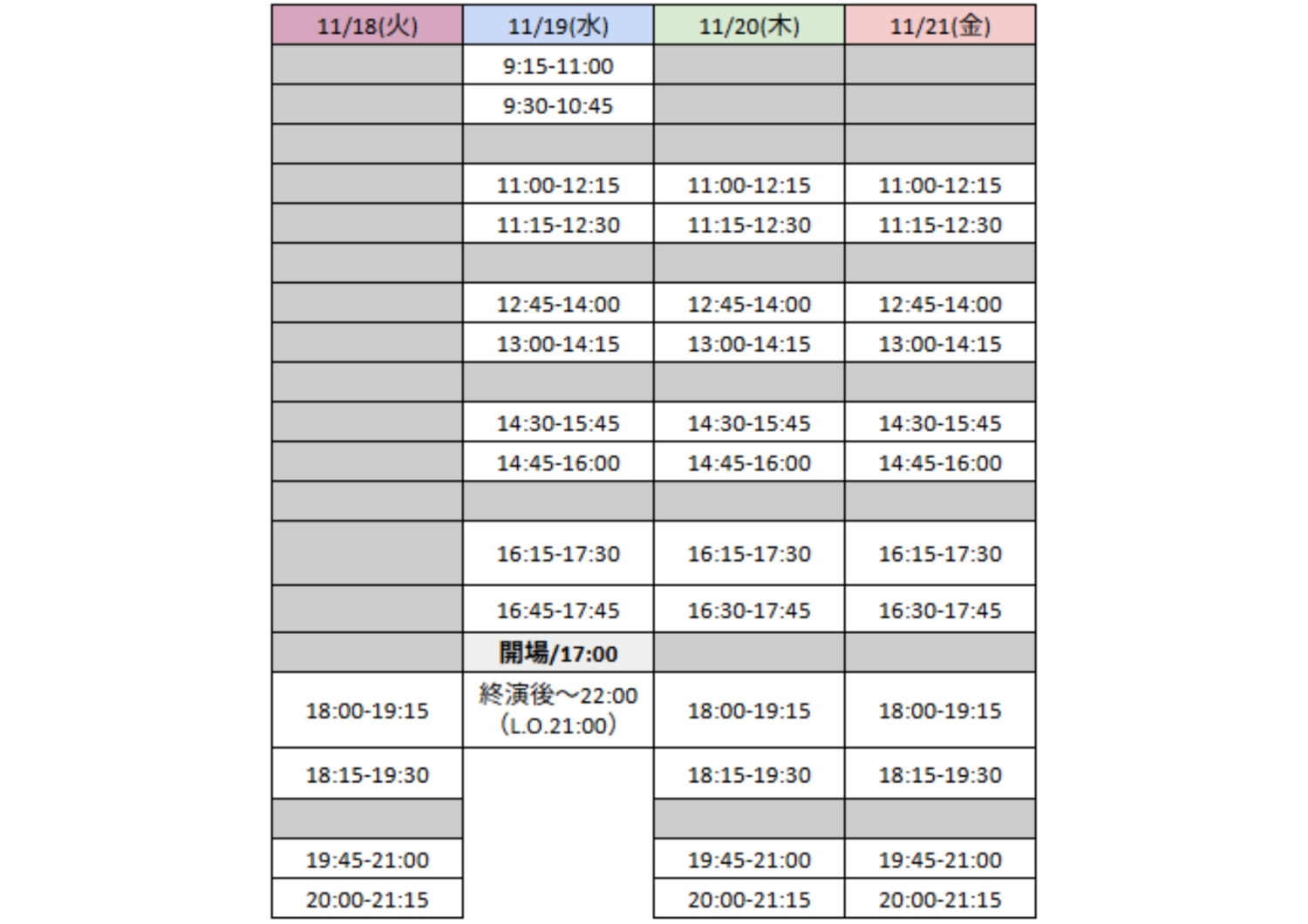 11/19(水)11:00~21:30 11/20(木)11:00~21:30 11/21(金)11:00~21:30