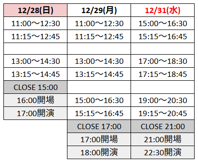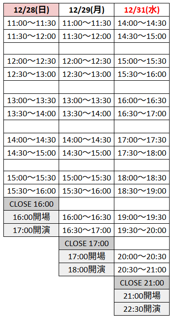 12/28(日)~31(水)開場後~開演前まで(2F以上)、終演30分前まで予定(1Fのみ)