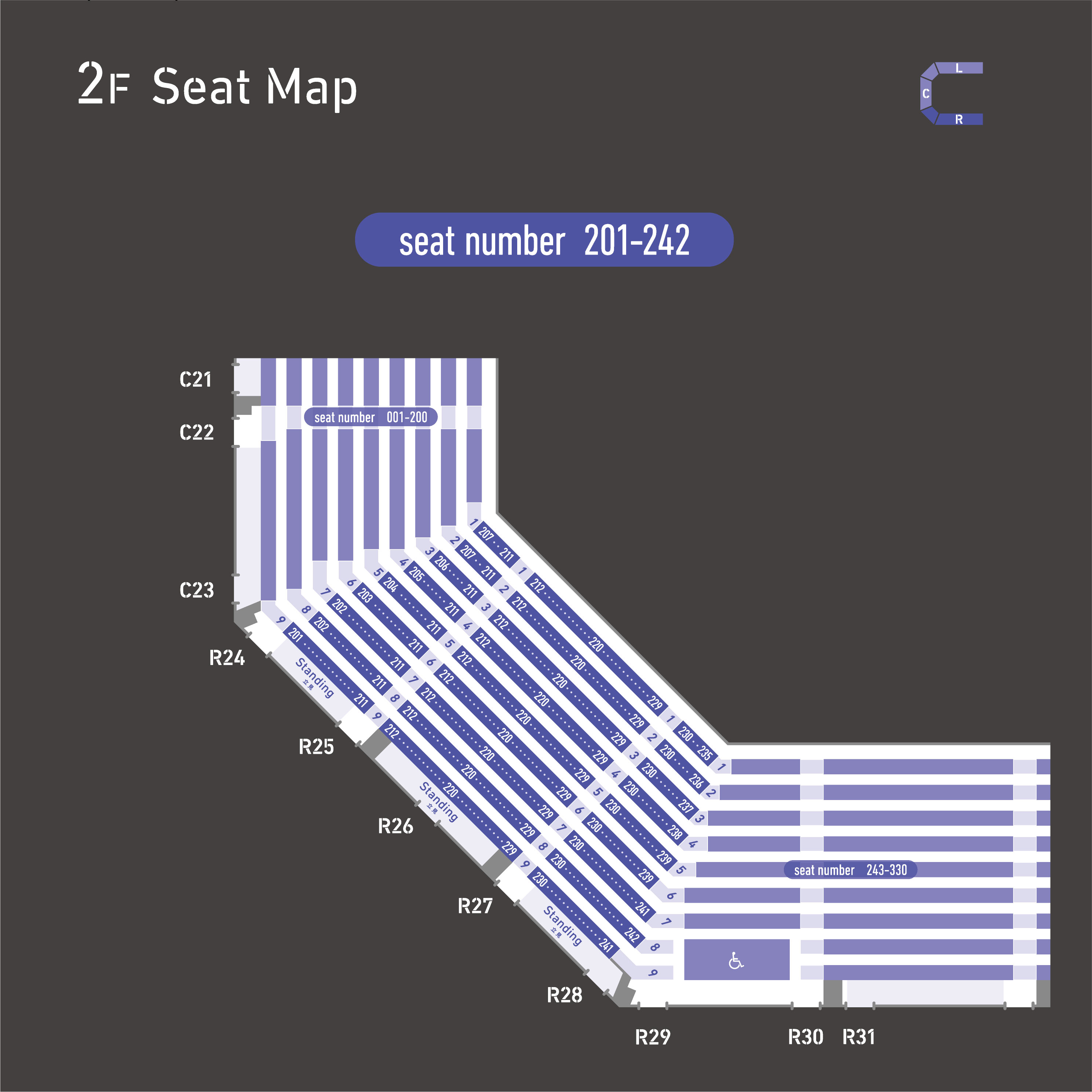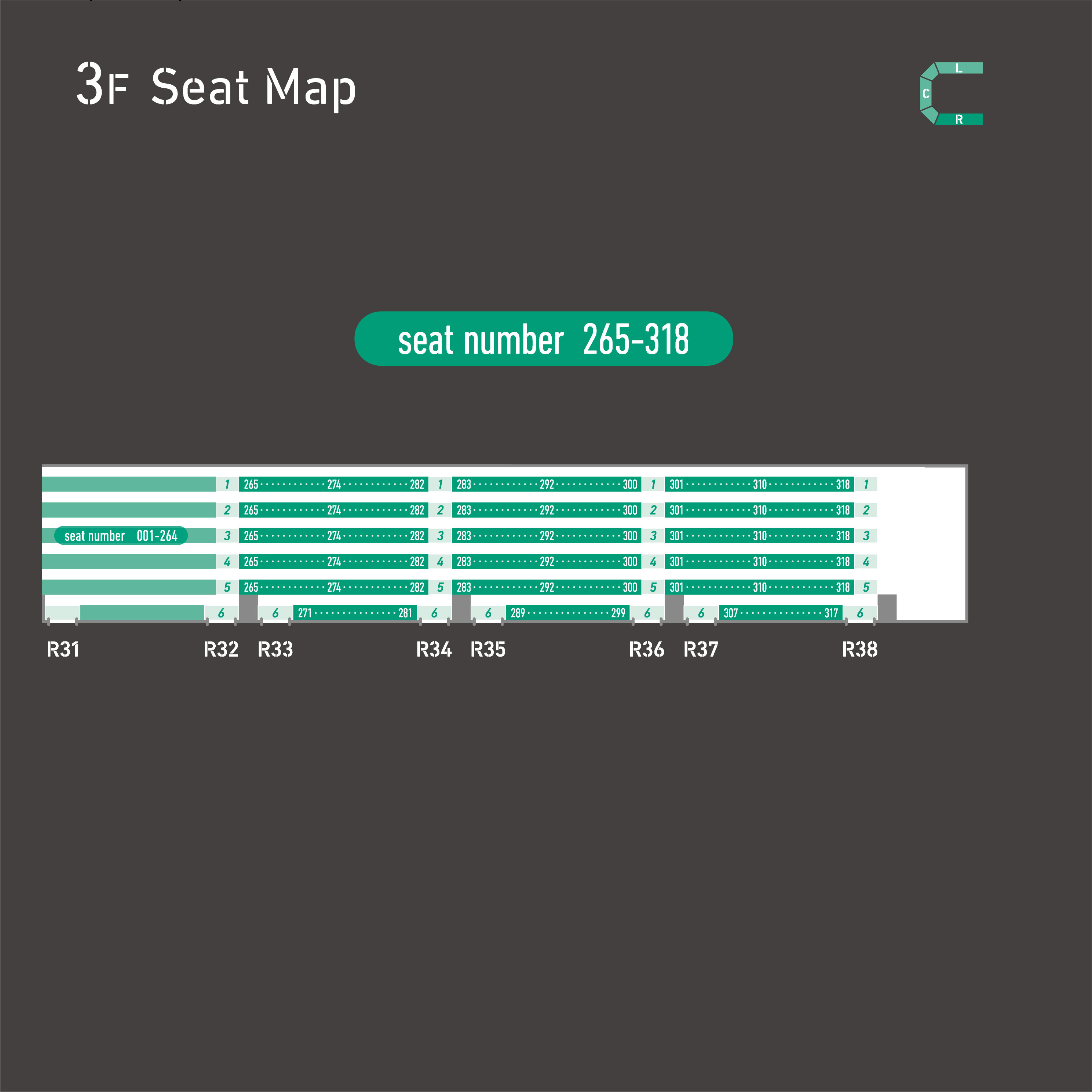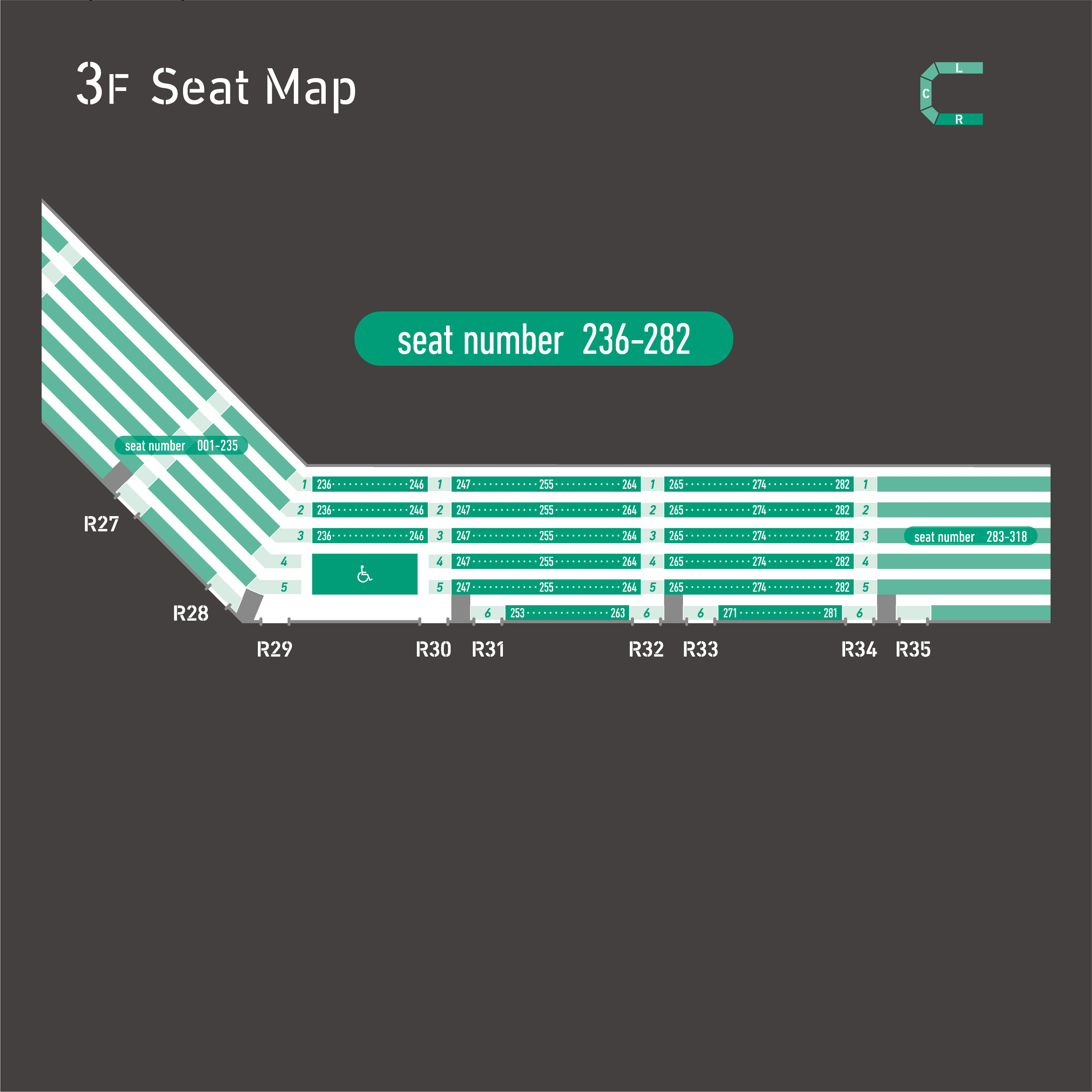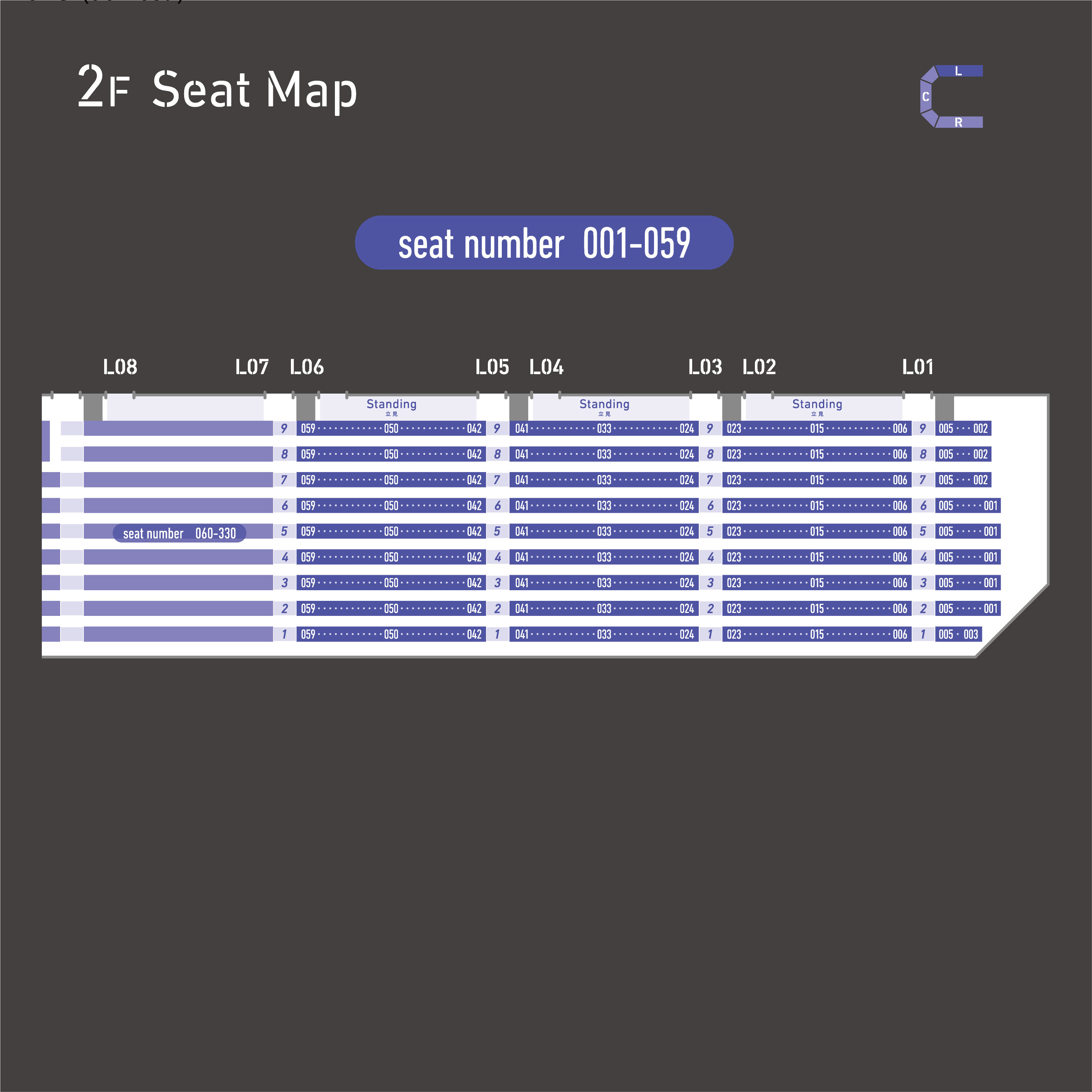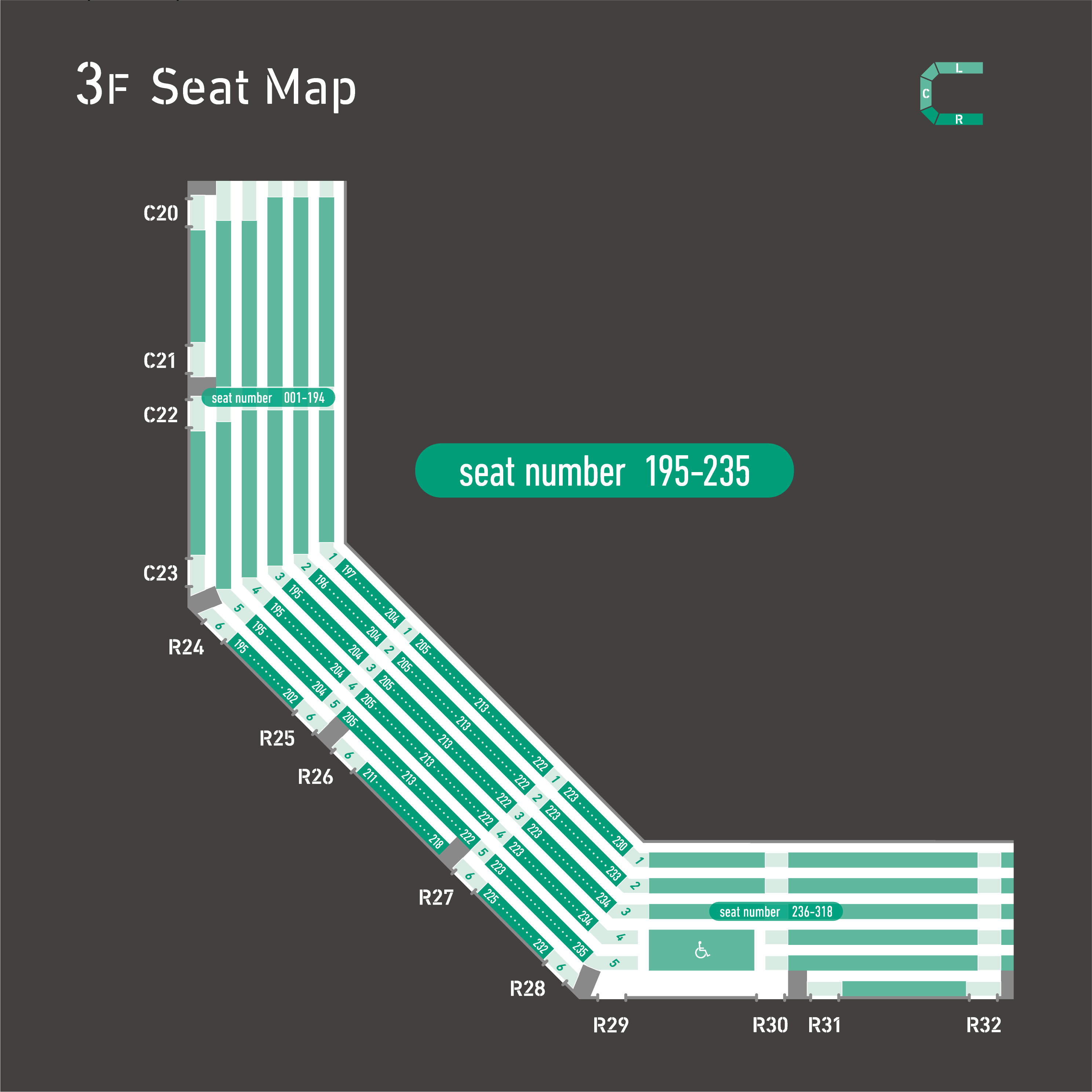 *2列137番,138番,193番,194番/3列136番,195番/4列135番,196番/6列134番,197番/8列132番,133番,198番,199番/9列131番,200番の座席にはドリンクホルダーのご用意がございません。